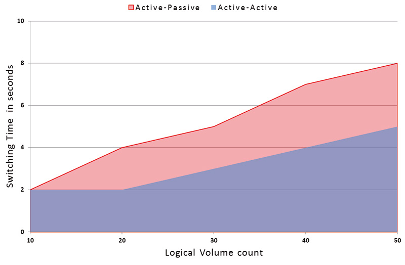 In diesen Tests wurden Systemausfälle simuliert und dabei bestimmt, welches System schneller auf den zweiten Node umschaltet, die Daten bereit stellt und darüber hinaus die Speicherressourcen effektiver nutzt. Dabei überraschte das Ergebnis nicht: Die Active-Active Lösung überragte in allen Tests.