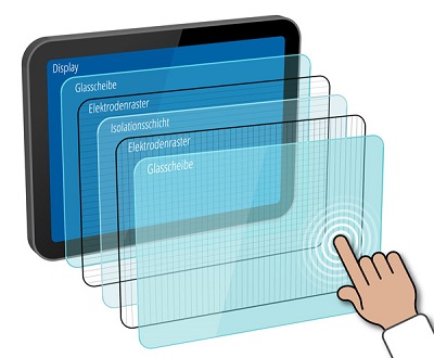 Projiziert-kapazitive-Touchscreens haben grundsätzlich dieselben Vorzüge wie Oberflächen-kapazitive-Displays und sind so für die gleichen Anwendungsgebiete geeignet. Allerdings können Sie aufgrund eines anderen Aufbaus deutlich dünner gefertigt werden. Der Grund dafür ist: bei ihnen sind die Sensoren auf der Rückseite montiert, während bei den Oberflächen-kapazitiven-Displays die Elektroden in der Bildschirmumfassung sitzen.