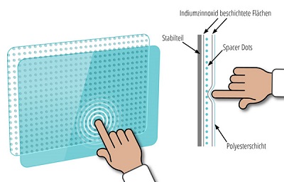 Die resistive Touchscreen-Technologie arbeitet hierbei mit zwei leitfähigen Schichten, wobei eine Lage aus einer Polyesterscheibe und die andere meist aus Glas oder Kunststoff besteht. Diese beiden Scheiben haben durch den Einsatz von Abstandshaltern (Spacer Dots) immer einen bestimmten Abstand zueinander und sind mit einem leitfähigen Material beschichtet. In den resistiven Touchscreens unserer Panel-PCs kommt etwa Indiumzinnoxid zum Einsatz. Wird der Touchscreen dann berührt, ändert sich punktuell der Abstand zwischen den Scheiben und damit auch der Widerstand. Durch das ständige Messen der unterschiedlichen elektrischen Spannungen kann am Ende die exakte Position des Druckpunktes bestimmt werden.
